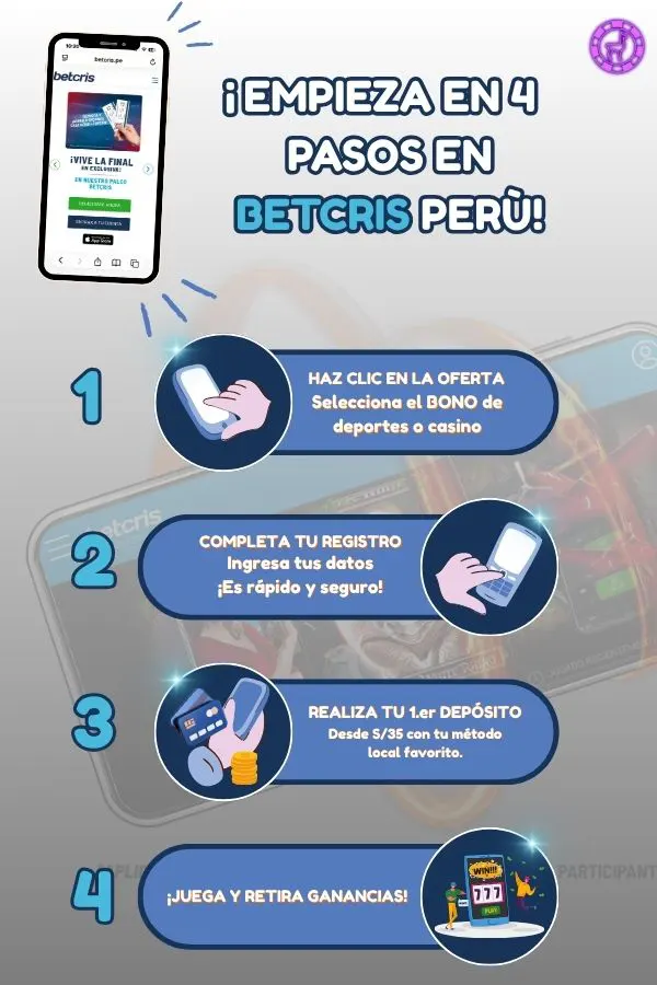 Para obtener los 20 giros gratis en Betcris Perú, debes: 1) Registrarte como nuevo usuario, 2) Depositar mínimo S/35, 3) Realizar una apuesta de S/4 o más, 4) Solicitar el código BC-PRIMERGIRO a través del chat de atención al cliente.